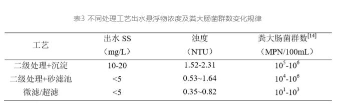 水中的懸浮顆粒物影響水中病原微生物含量,不同處理工藝出水懸浮物濃度與糞大腸菌群數(shù)如表3所示。同時(shí)懸浮顆粒物還能夠?qū)ο拘Чa(chǎn)生直接影響。通過(guò)協(xié)同消毒工藝前端砂濾、膜過(guò)濾等處理單元的設(shè)置,提高水中懸浮顆粒物的截留效果。可有效提升臭氧、紫外與次氯酸鈉對(duì)直接暴露在水中的病原微生物的滅活效率,過(guò)濾工藝在對(duì)致濁顆粒物去除的同時(shí)伴隨著部分病原微生物的截留。