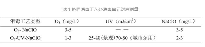 “臭氧-紫外-氯”三協(xié)同消毒工藝中,紫外為主消毒單元,根據(jù)臭氧運(yùn)行情況,調(diào)整臭氧投加劑量維持1-3 mg/L。在紫外消毒單元中,景觀用再生水紫外劑量為25-40 mJ/cm2,城市雜用再生水紫外劑量為70-80 mJ/cm2,而紫外后端投加次氯酸鈉的主要目的是維持適當(dāng)?shù)挠嗦缺3窒镜某掷m(xù)性。針對(duì)不同協(xié)同消毒組合工藝,其運(yùn)行參數(shù)見(jiàn)表4。