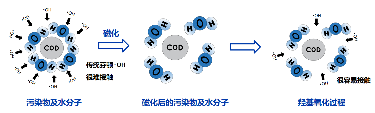 Super Cheap磁芬頓技術(shù):先將廢水磁化,改變污染物分子與水分子之間的排列次序,使羥基自由基很容易接觸到COD,采用定點清除的方法去氧化COD,H2O2的消耗量極低,只有流化床芬頓的30-40%。在實際工程項目中,體現(xiàn)為:雙氧水投加量少,無需配套脫氣池;